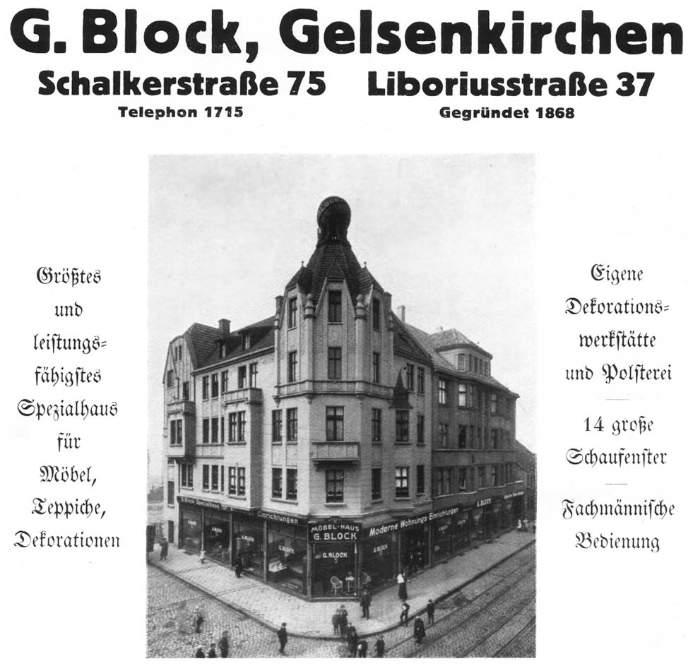 Die jüdische Familie Block lebte an der Schalker Straße 75, direkt an der Kreuzung Liboriusstraße. Im gleichen Haus betrieb die in Gelsenkirchen bekannte und angesehene jüdische Familie ein Möbelgeschäft, dass bereits 1868 von Gumpel Block an der Liboriusstraße 37 gegründet wurde. Nach dem Tod von Gumpel Block wurde der alteingesessene Familienbetrieb 1905 mit einem Neubau an der Schalker Straße 75 erweitert. Mit der Machtübergabe 1933 an die Nazis verschlechterte sich die gesamte Lebenssituation der Familie Block zusehends. Ab diesem Zeitpunkt war auch Familie Block dem ständig zunehmenden Verfolgungsdruck durch die NS-Behörden ausgesetzt. Das Geschäft wurde boykottiert, immer mehr Kunden blieben in der Folge aus. So wurde auch der Familie Block kontinuierlich die wirtschaftliche Existenzgrundlage entzogen.