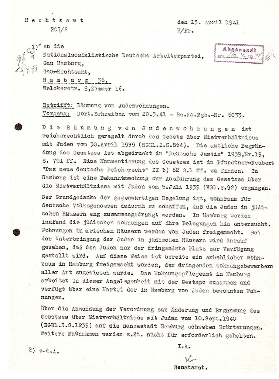 In einer vertraulichen Niederschrift hieß es: "Der ursprüngliche Plan, die Juden an mehreren Stellen im Stadtgebiet zusammenzuziehen, ist aufgegeben worden. Nunmehr hat der Führer auf Antrag des Reichsstatthalters entschieden, dass die hier wohnenden Juden bis auf ganz Alte und Sieche nach Osten evakuiert werden sollen. [...] Gerechnet wird [alsbald] mit einem Zugang von ca. 1.000 freien Wohnungen auf Grund dieser Maßnahme." Seit April 1942 wurden in Hamburg die Träger von "Judensternen" zwangsweise in Judenhäuser eingewiesen; betroffen waren davon ab Herbst 1942 auch die Partner aus "nichtprivilegierten Mischehen". Ab 1943 mussten in einigen Reichsgauen auch Partner aus "privilegierten Mischehen" in die so genannten "Judenhäuser" umziehen. In Hamburg wurden pro Person sechs bis acht Quadratmeter Wohnfläche zugestanden.