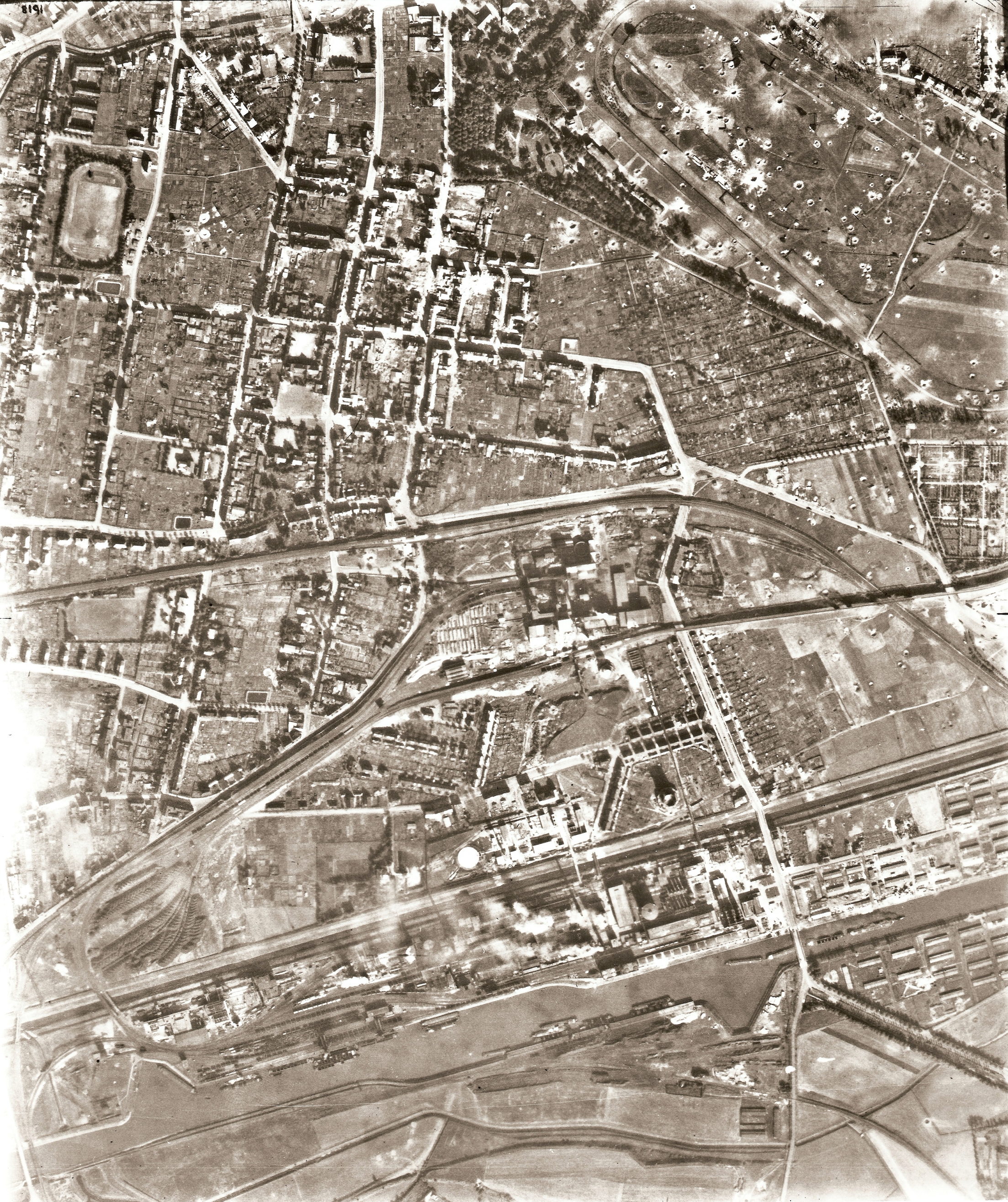 Abb.: Ausschnitt aus einem Befliegungsfoto der Alliierten, Bereich Gelsenkirchen-Horst Süd vom September 1944. Neben dem Fürstenbergstadion liegt die von Franz-Josef Kämper nachfolgend beschriebene Flakstellung, in den Markierungen sind mittig die hölzernen Flaktürme zu erkennen. VERGRÖßERN